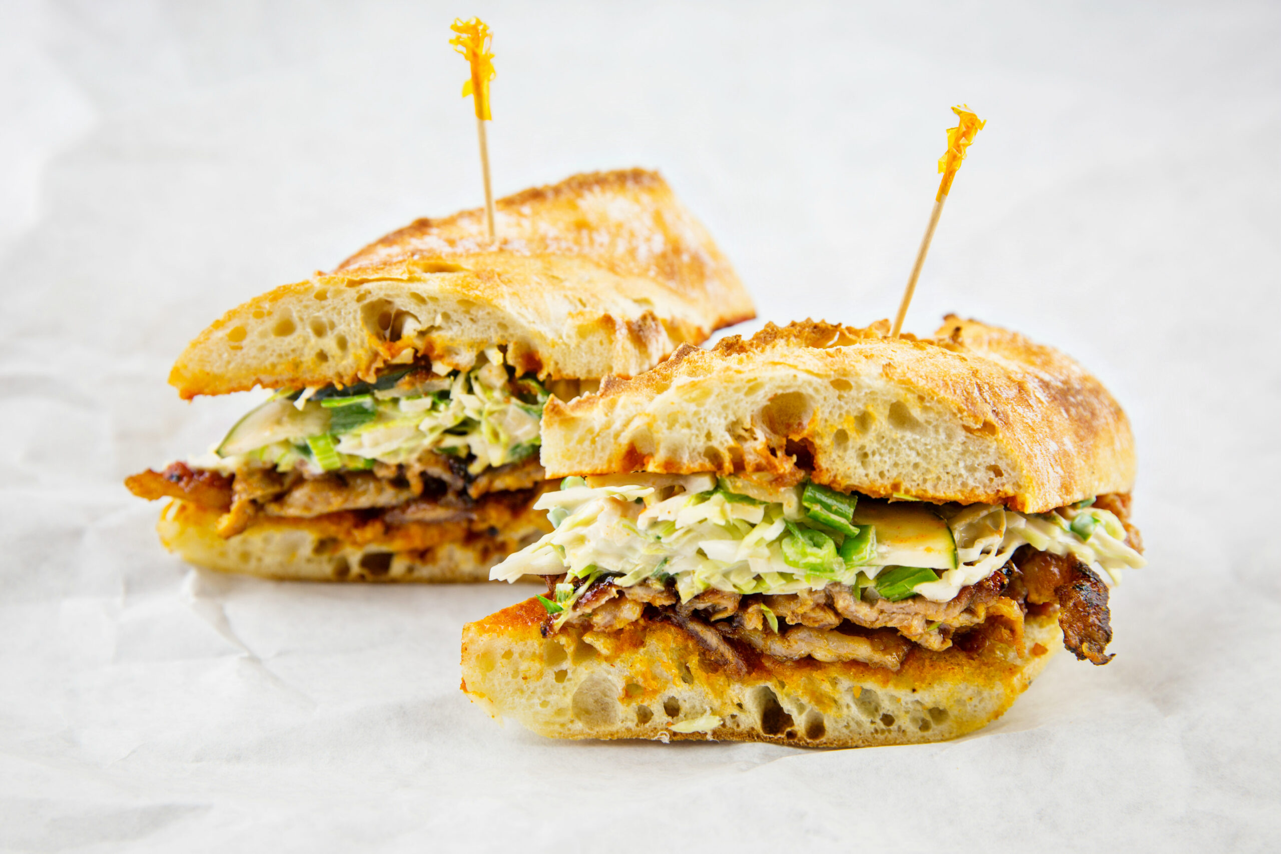 Thinly sliced pork shoulder, sautéed in a traditional Korean BBQ sauce, then topped with fresh Asian coleslaw, pickled cucumbers, and scallions on toasted Baguette.